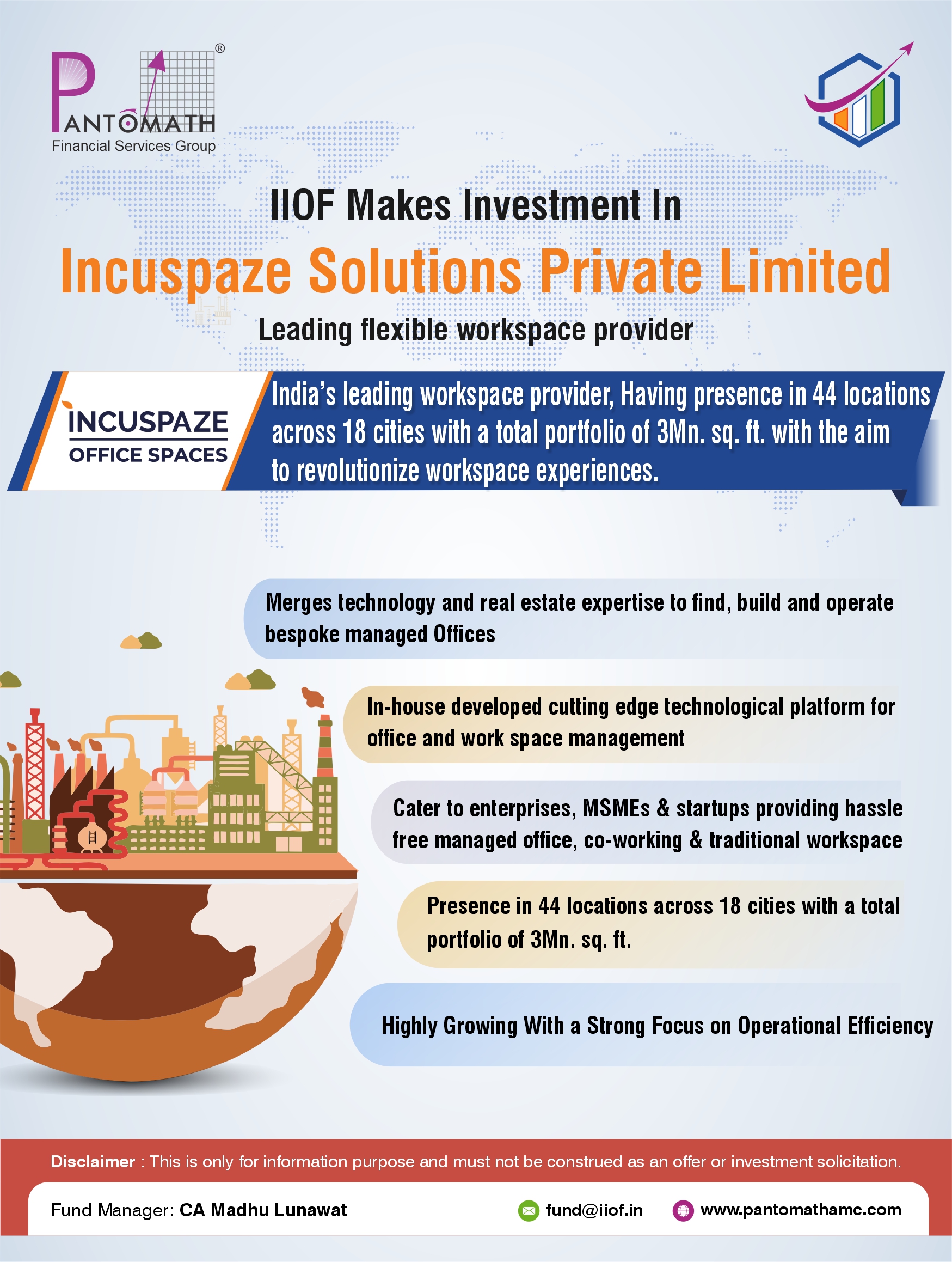 Established in 2016, Incuspaze is India’s leading workspace provider, has marked its presence in 44 locations across 18 cities with a total portfolio of 3Mn. sq. ft. with the aim to revolutionize workspace experiences. Positioned in both Tier- 1 and Tier-2 cities, Incuspaze distinguishes itself by providing ‘Space a Service’ with seamless integration of technology and real estate. The company’s diverse services cater to enterprises, MSMEs and startups providing hassle free managed office, co-working & traditional workspace solutions.